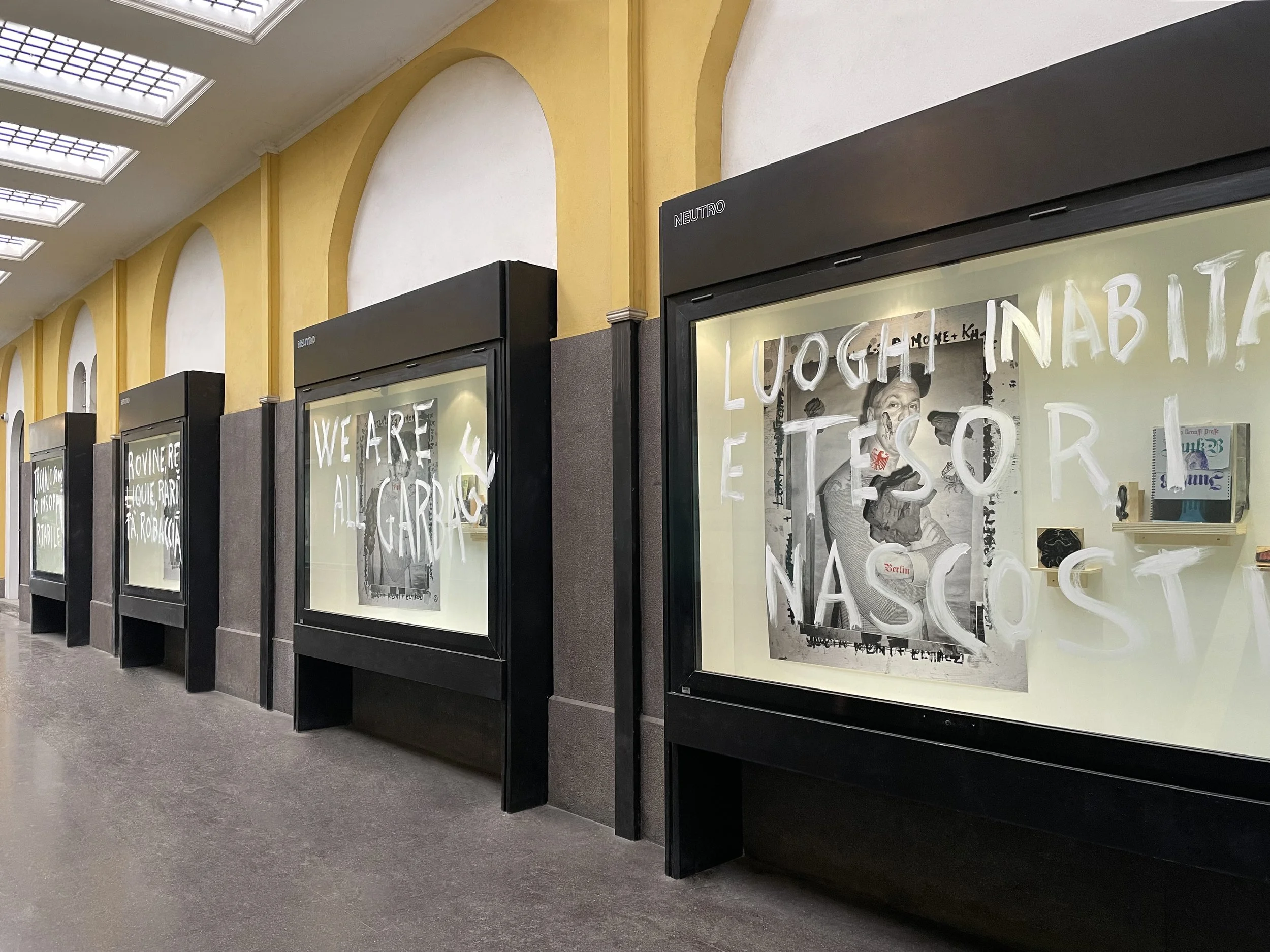 Alle opere Benassi aggiunge pezzi di legno, timbri, fanzine; si appropria di estratti del testo scritto da Carlo Antonelli per la pubblicazione che accompagna la mostra e li dipinge con la vernice sui vetri delle bacheche. Una stratificazione di elementi cruda ed enigmatica dove le rovine si confondono con le reliquie, le rarità con la robaccia.